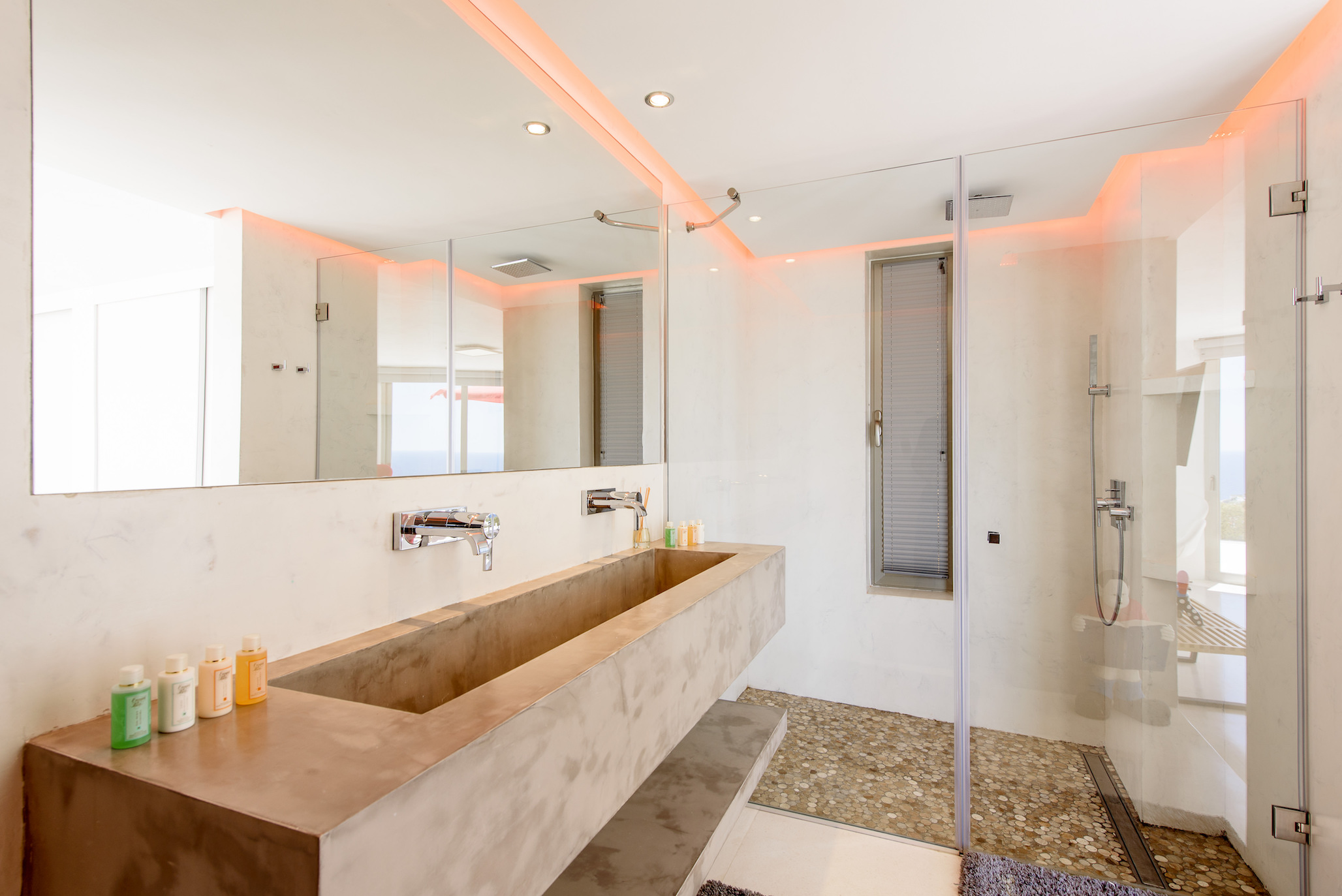 The six spacious bedrooms are all en-suite, with mood lighting in the polished cement bathrooms, terrace access, and the same sophisticated minimalism throughout.